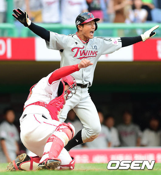 29일 오후 인천 문학구장에서 열린 '2014 한국야쿠르트 세븐 프로야구' SK 와이번스와 LG 트윈스의 경기 5회초 1사 1,2루 이병규의 1타점 2루타에 2루주자 임재철이 홈에서 세이프되고 있다.