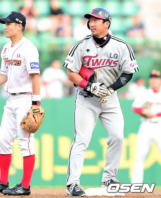 29일 오후 인천 문학구장에서 열린 '2014 한국야쿠르트 세븐 프로야구' SK 와이번스와 LG 트윈스의 경기 5회초 1사 1,2루 이병규가 1타점 2루타를 치고 2루 베이스에 서 있다.