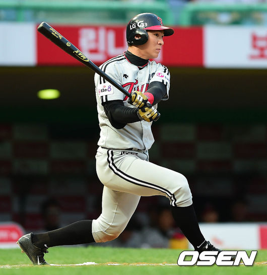 29일 오후 인천 문학구장에서 열린 '2014 한국야쿠르트 세븐 프로야구' SK 와이번스와 LG 트윈스의 경기 6회초 선두타자 오지환이 우익수 오른쪽 2루타를 치고 있다.