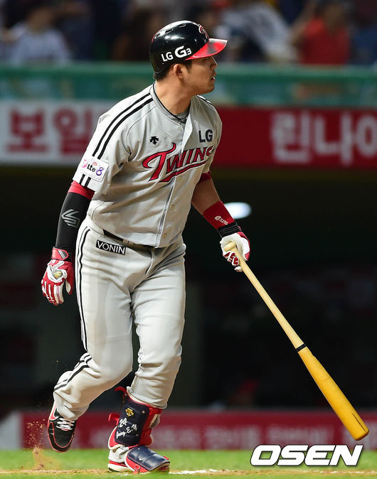 29일 오후 인천 문학구장에서 열린 '2014 한국야쿠르트 세븐 프로야구' SK 와이번스와 LG 트윈스의 경기 7회초 2사 1루 정의윤이 투런 홈런을 치고 날아가는 타구를 바라보고 있다.