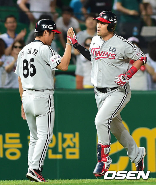 29일 오후 인천 문학구장에서 열린 '2014 한국야쿠르트 세븐 프로야구' SK 와이번스와 LG 트윈스의 경기 7회초 2사 1루 정의윤이 투런 홈런을 치고 최태원 코치와 하이파이브를 하고 있다.