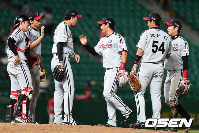 29일 오후 인천 문학구장에서 열린 '2014 한국야쿠르트 세븐 프로야구' SK 와이번스와 LG 트윈스의 경기 종료 후 LG 선수들이 하이파이브를 하고 있다.