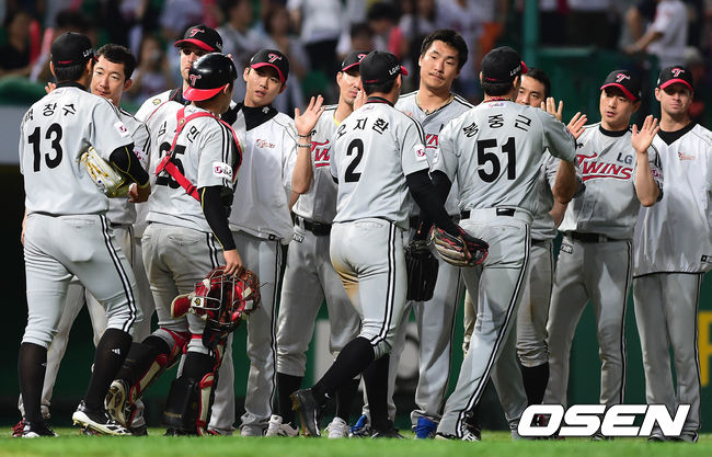 29일 오후 인천 문학구장에서 열린 '2014 한국야쿠르트 세븐 프로야구' SK 와이번스와 LG 트윈스의 경기 종료 후 LG 선수들이 하이파이브를 하고 있다.