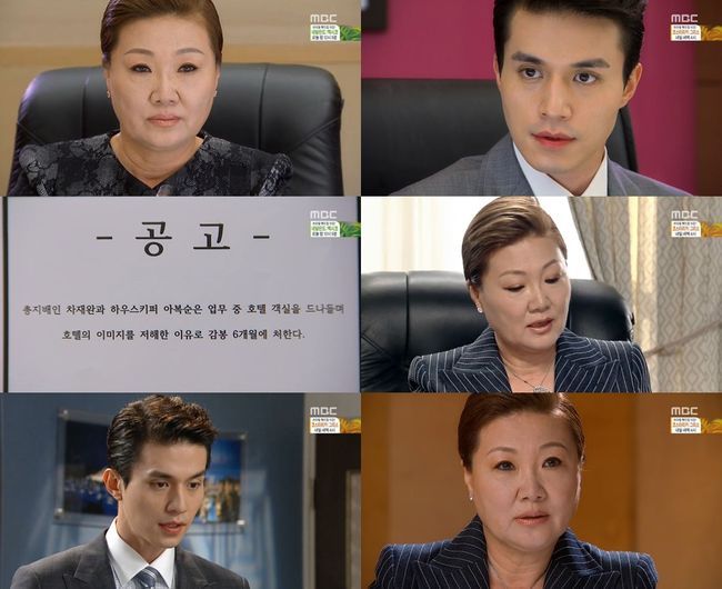 29일 오후 방송된 MBC 주말드라마 '호텔킹'에서는 대립각을 세우는 백미녀(김해숙 분)와 차재완(이동욱 분)의 모습이 전파를 탔다.