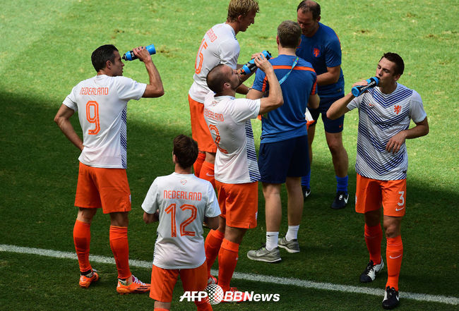 [OSEN=사진팀] 30일 오전(한국시간) 브라질 포스탈레자의 카스텔랑 주경기장에서 열린 '2014 브라질 월드컵' 16강전 네덜란드와 멕시코의 경기전 네덜란드 선수들이 얼굴에 물을 뿌리고 있다