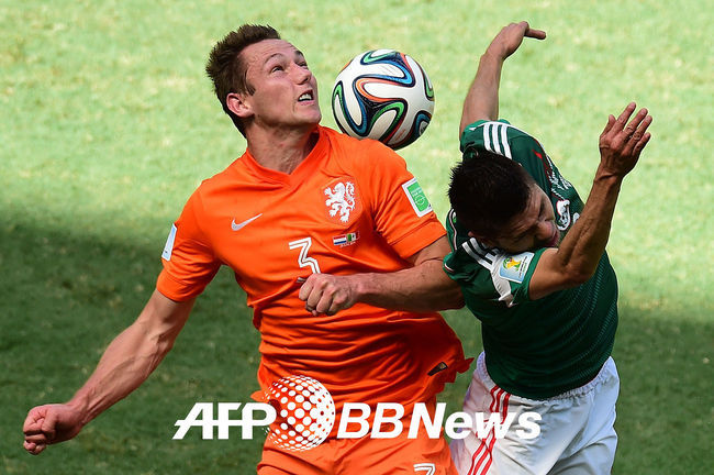 [OSEN=사진팀] 30일 오전(한국시간) 브라질 포스탈레자의 카스텔랑 주경기장에서 열린 '2014 브라질 월드컵' 16강전 네덜란드와 멕시코의 경기, 전반 네덜란드 데브라이와 멕시코 페랄타가 공중볼을 다투고 있다