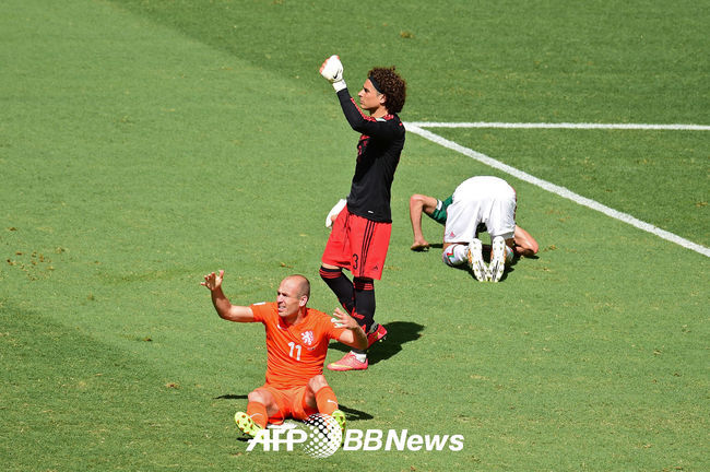 [OSEN=사진팀] 30일 오전(한국시간) 브라질 포스탈레자의 카스텔랑 주경기장에서 열린 '2014 브라질 월드컵' 16강전 네덜란드와 멕시코의 경기, 전반 네덜란드 로번이 판정에 항의하고 있다