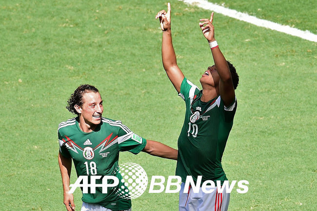 [OSEN=사진팀] 30일 오전(한국시간) 브라질 포스탈레자의 카스텔랑 주경기장에서 열린 '2014 브라질 월드컵' 16강전 네덜란드와 멕시코의 경기, 후반 산토스가 선취골을 넣고 동료들과 기뻐하고 있다