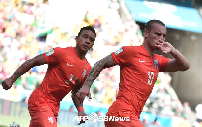 [OSEN=사진팀] 30일 오전(한국시간) 브라질 포스탈레자의 카스텔랑 주경기장에서 열린 '2014 브라질 월드컵' 16강전 네덜란드와 멕시코의 경기, 후반 네덜란드 스네이더가 동점골을 넣고 동료들과 기뻐하고 있다