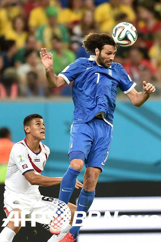 [OSEN=사진팀] 30일(한국시간) 브라질 헤시피의 아레나 페르남부쿠에서 2014 브라질월드컵 16강전 코스타리카와 그리스의 경기, 전반 사마라스가 헤딩을 하고 있다