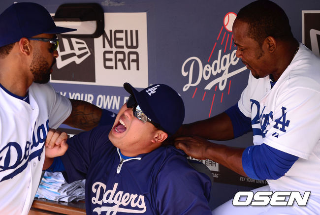 다저스 켐프와 유리베가 류현진에게 장난을 치고 있다.