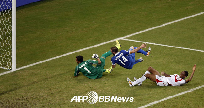 [OSEN=사진팀] 30일(한국시간) 브라질 헤시피의 아레나 페르남부쿠에서 2014 브라질월드컵 16강전 코스타리카와 그리스의 경기, 전반 살핑기디스가 골찬스를 놓치고 있다