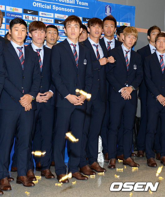 귀국 인터뷰에 앞서 축구 대표팀이 한 축구팬이 던진 엿을 바라보고 있다.