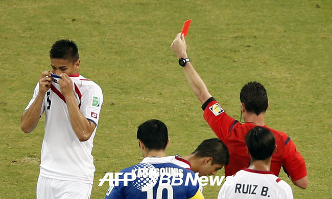 [OSEN=사진팀] 30일(한국시간) 브라질 헤시피의 아레나 페르남부쿠에서 2014 브라질월드컵 16강전 코스타리카와 그리스의 경기, 후반 두아르테가 경고누적으로 퇴장당하고 있다