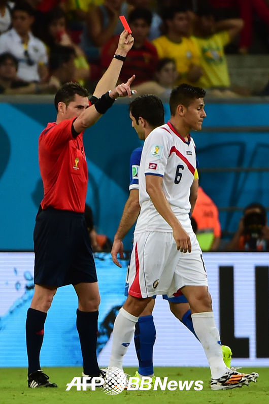 [OSEN=사진팀] 30일(한국시간) 브라질 헤시피의 아레나 페르남부쿠에서 2014 브라질월드컵 16강전 코스타리카와 그리스의 경기, 후반 두아르테가 경고누적으로 퇴장당하고 있다