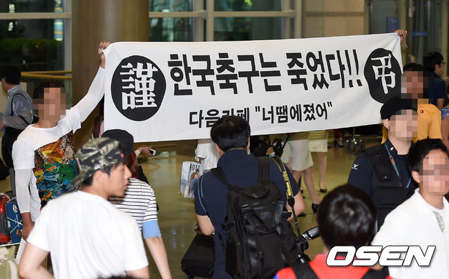 입국장에 시민들이 '한국 축구는 죽었다'라는 현수막을 들고 서 있다.