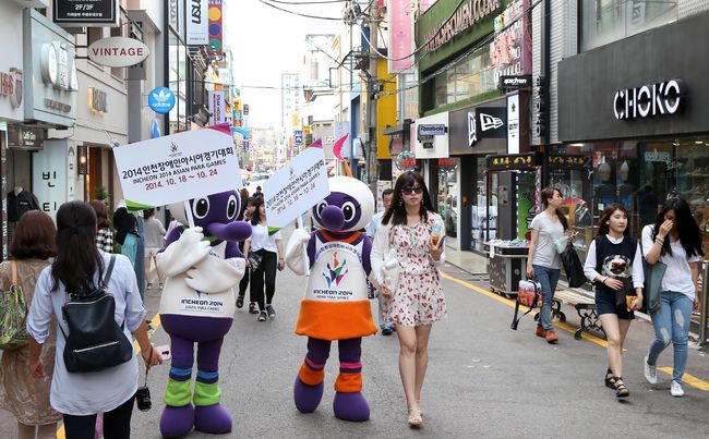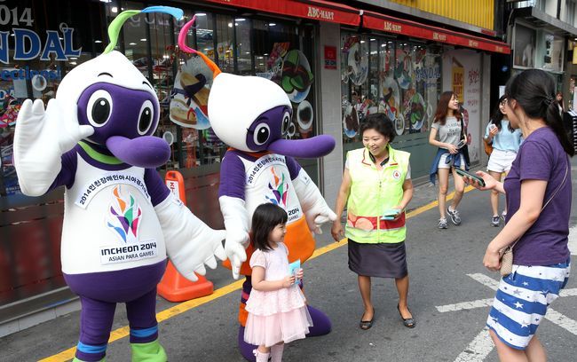 젊음의 열기가 가득한 인천 부평 문화의거리에 2014인천장애인아시아경기대회 마스코트인 저노피와 드노피가 나서 시민들의 눈길을 사로잡았다.