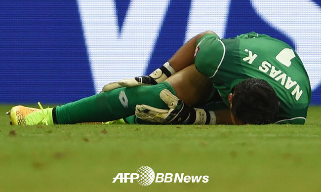 [OSEN=사진팀] 30일(한국시간) 브라질 헤시피의 아레나 페르남부쿠에서 2014 브라질월드컵 16강전 코스타리카와 그리스의 경기, 연장 나바스 골키퍼가 쓰러져 고통스러워하고 있다.