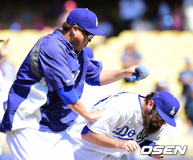 다저스 류현진이 밴 슬라이크와 장난을 치고 있다./youngrae@osen.co.kr