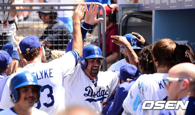 5회말 2사 2,3루 다저스 이디어가 스리런 홈런을 때린 뒤 동료들과 기뻐하고 있다./youngrae@osen.co.kr