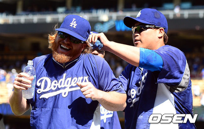 다저스 류현진과 터너가 장난을 치고 있다./youngrae@osen.co.kr