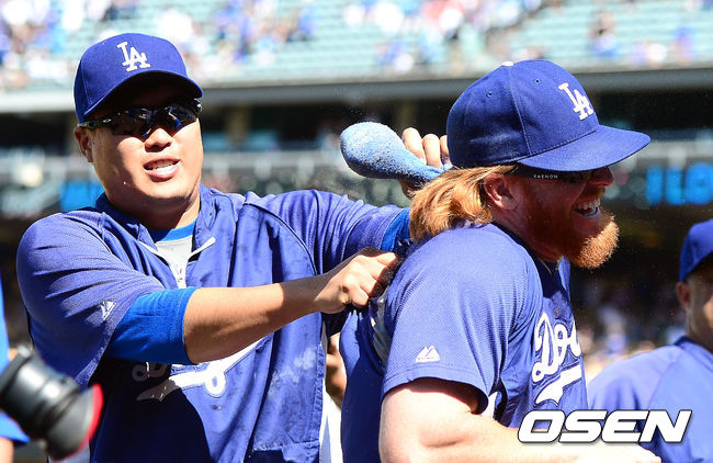 다저스 류현진이 터너와 장난을 치고 있다./youngrae@osen.co.kr