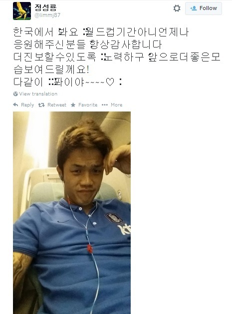정성룡은 29일 자신의 트위터에 "한국에서 봐요. 월드컵 기간, 아니 언제나 응원해주는 분들 항상 감사합니다"라는 글과 함께 사진 한 장을 게재했다. 그리고 "더 진보할 수 있도록 노력하고 앞으로 더 좋은 모습 보여드릴게요! 다같이 '퐈이야'"라고 덧붙였다.