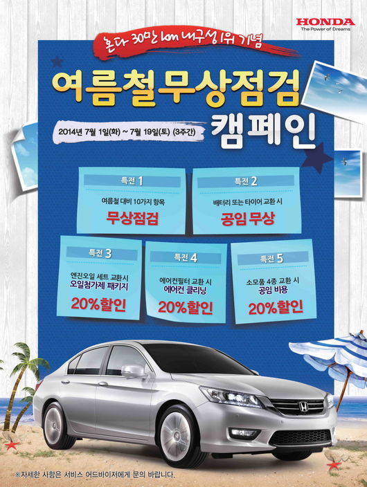 혼다코리아(www.hondakorea.co.kr 대표이사 정우영)가 자사의 대표 베스트셀링 세단 ‘어코드’의 “30만km 내구성 1위” 선정을 기념해 여름철 차량 무상점검 캠페인을 실시한다.