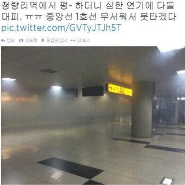 서울 지하철 청량리역에 정차 중이던 용산행 전동차에서 화재사고로 추정되는 사고가 발생해 시민들이 긴급 대피했다. 폭발음과 연기로 인해 시민들이 순간적으로 공포에 빠졌다.