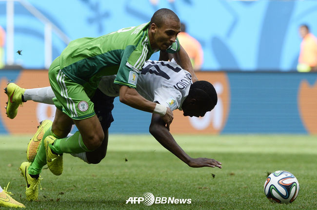 [OSEN=사진팀] 1일(한국시간) 브라질 브라질리아 에스타디오 나시오날 경기장에서 진행된 '2014 브라질 월드컵' 프랑스와 나이지리아의 16강전 경기, 전반 나이지리아 오뎀윙기가 프랑스 수비수와 몸싸움을 펼치고 있다.