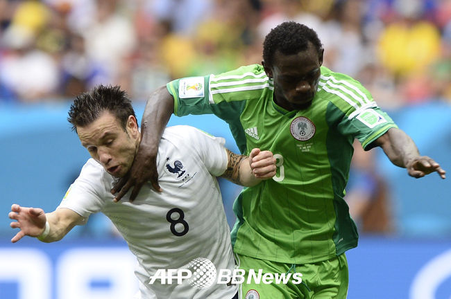 [OSEN=사진팀] 1일(한국시간) 브라질 브라질리아 에스타디오 나시오날 경기장에서 진행된 '2014 브라질 월드컵' 프랑스와 나이지리아의 16강전 경기, 후반 프랑스 발부에나와 나이지리아 오샤니와가 몸싸움을 펼치고 있다.