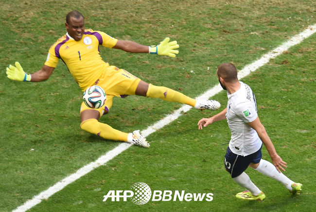 [OSEN=사진팀] 1일(한국시간) 브라질 브라질리아 에스타디오 나시오날 경기장에서 진행된 '2014 브라질 월드컵' 프랑스와 나이지리아의 16강전 경기, 후반 옌예마 골키퍼가 벤제마의 슛을 막아내고 있다