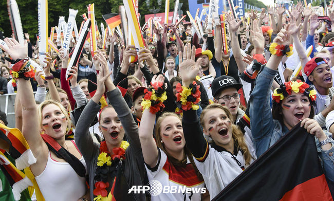 [OSEN=사진팀] 1일(한국시간) 오전(한국시간) 브라질 포르투 알레그리의 에스타디오 베이라-리오 경기장에서 열린 2014 브라질 월드컵 16강전 독일-알제리의 경기, 독일 팬들이 열띤 응원을 펼치고 있다.