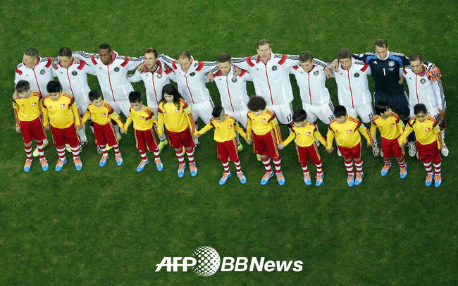 [OSEN=사진팀] 1일(한국시간) 오전(한국시간) 브라질 포르투 알레그리의 에스타디오 베이라-리오 경기장에서 열린 2014 브라질 월드컵 16강전 독일-알제리의 경기, 독일선수들이 국가를 부르고 있다