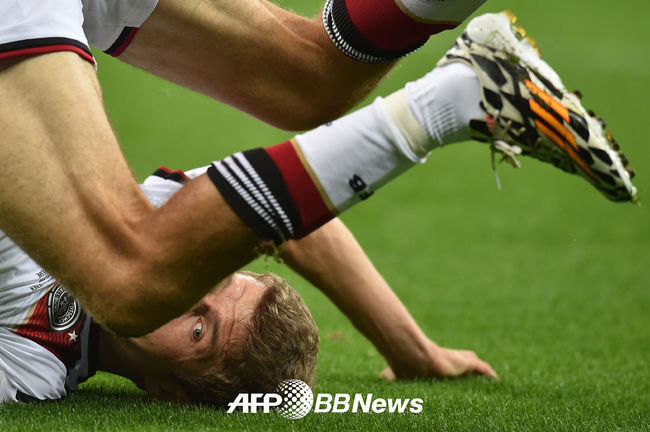 [OSEN=사진팀] 1일(한국시간) 오전(한국시간) 브라질 포르투 알레그리의 에스타디오 베이라-리오 경기장에서 열린 2014 브라질 월드컵 16강전 독일-알제리의 경기, 전반 뮐러가 쓰러져 있다