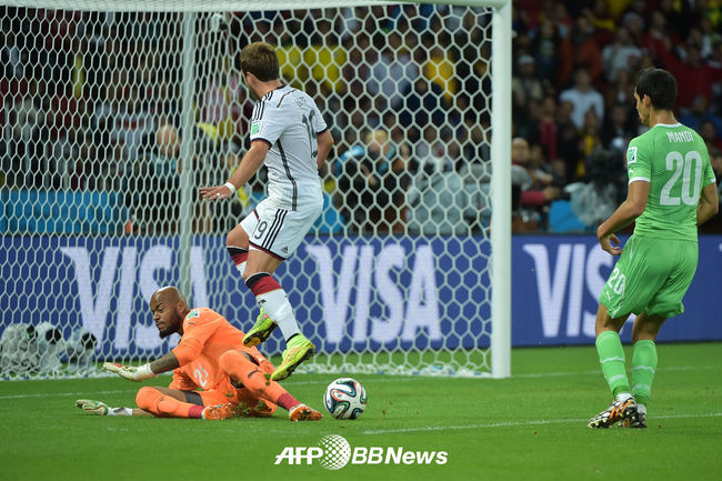 [OSEN=사진팀] 1일(한국시간) 오전(한국시간) 브라질 포르투 알레그리의 에스타디오 베이라-리오 경기장에서 열린 2014 브라질 월드컵 16강전 독일-알제리의 경기, 전반 음보리 골키퍼가 독일 괴체의 슛을 막아내고 있다.