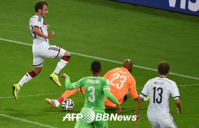 [OSEN=사진팀] 1일(한국시간) 오전(한국시간) 브라질 포르투 알레그리의 에스타디오 베이라-리오 경기장에서 열린 2014 브라질 월드컵 16강전 독일-알제리의 경기, 전반 음보리 골키퍼가 독일 괴체의 슛을 막아내고 있다.