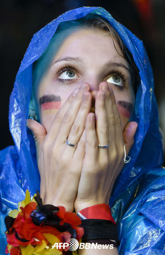 [OSEN=사진팀] 2014 브라질 월드컵 16강전 독일-알제리의 경기가 열린 1일(한국시간) 독일 베를린 광장에서 독일 축구팬이 경기를 지켜보고 있다.