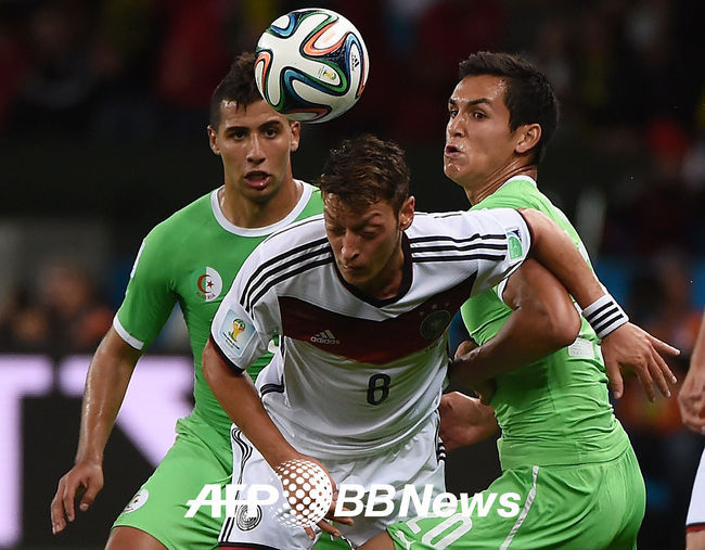 [OSEN=사진팀] 1일(한국시간) 오전(한국시간) 브라질 포르투 알레그리의 에스타디오 베이라-리오 경기장에서 열린 2014 브라질 월드컵 16강전 독일-알제리의 경기, 후반 외질이 알제리 수비에 막혀 고전하고 있다