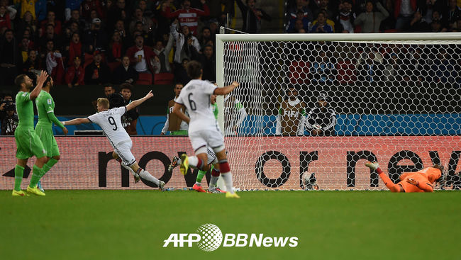 [OSEN=사진팀] 1일(한국시간) 오전(한국시간) 브라질 포르투 알레그리의 에스타디오 베이라-리오 경기장에서 열린 2014 브라질 월드컵 16강전 독일-알제리의 경기, 연장 전반 독일 쉬를레가 선취골을 넣고 있다.