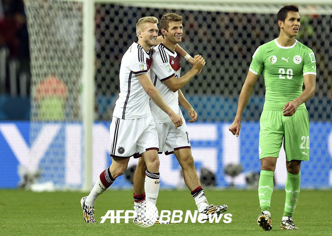 [OSEN=사진팀] 1일(한국시간) 오전(한국시간) 브라질 포르투 알레그리의 에스타디오 베이라-리오 경기장에서 열린 2014 브라질 월드컵 16강전 독일-알제리의 경기, 연장 전반 독일 쉬를레가 선취골을 넣고 환호하고 있다.
