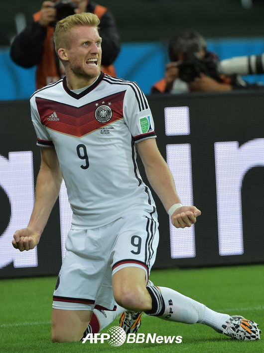 [OSEN=사진팀] 1일(한국시간) 오전(한국시간) 브라질 포르투 알레그리의 에스타디오 베이라-리오 경기장에서 열린 2014 브라질 월드컵 16강전 독일-알제리의 경기, 연장 전반 독일 쉬를레가 선취골을 넣고 환호하고 있다.