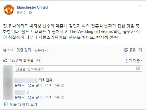 지난 2005년 맨유에 입단한 박지성은 7년 동안 최고의 활약을 펼쳤다. 덕분에 맨유는 한국에서 국민구단 이미지를 갖게 됐다. 이에 맨유는 한국인 직원까지 고용해 적극적으로 SNS를 관리하고 있다.