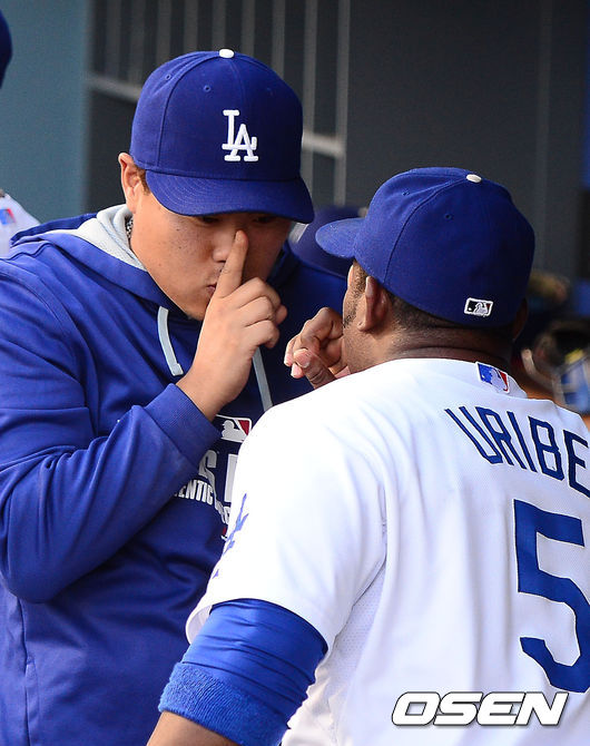 다저스 류현진과 유리베가 세레머니를 하고 있다.
