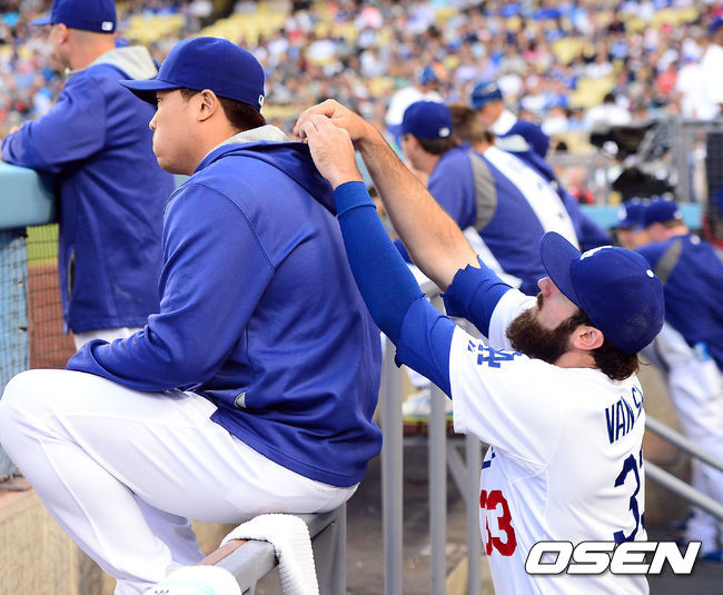 다저스 밴 슬라이크가 류현진에게 장난을 치고 있다.