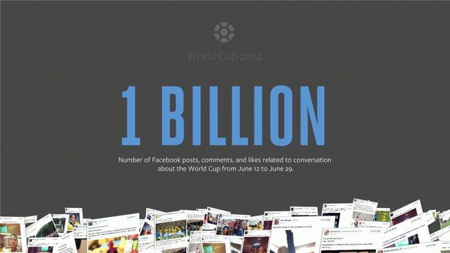 페이스북에 따르면 이번 브라질 월드컵에 대해 페이스북에 게시물, 댓글 및 좋아요를 남긴 사용자는 모두 2억 2000만 명에 달하며 생성된 활동은 10억 건에 이른다. 이는 올해 열린 미국 최대 스포츠 이벤트인 수퍼볼, 소치 동계올림픽 그리고 아카데미 시상식 기간 중 발생한 관련 페이스북 게시물, 댓글 및 좋아요를 모두 합친 것 보다 많은 수치다.