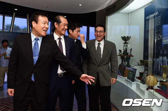 두산 레전드 김유동, 박철순, 안경현, 김상호가 전시관을 둘러보고 있다.