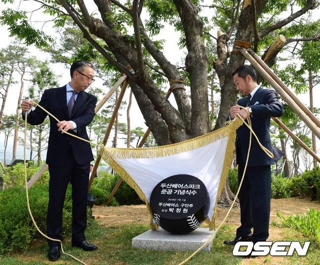 박정원 구단주(오른쪽)와 박지원 부회장이 기념 식수식을 하고 있다.
