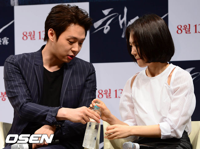 1일 오전 서울 압구정 CGV에서 진행된 영화 '해무' 제작보고회에서 배우 박유천이 한예리의 물병을 열어주려 하고 있다.