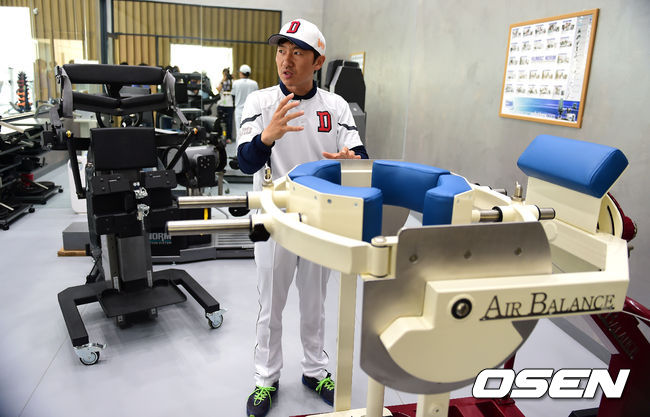 두산 홍성대 트레이너가 재활 치료실에서 설명하고 있다.